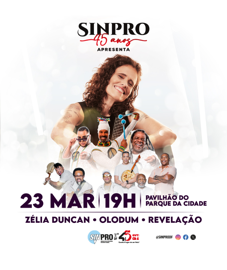 Atenção, sindicalizadas(os)! Os grupos Olodum e Revelação e a cantora Zélia Duncan, estarão em Brasília no dia 23 de março para celebrar o aniversário do Sinpro! A partir das 19h, o Pavilhão do Parque da Cidade recebe a festa dos 45 anos de fundação do Sindicato dos Professores no DF, com o esquenta do DJ Chokolaty! A entrada é gratuita para você e seu(sua) acompanhante, contanto que você apresente a carteirinha de sindicalizado(a).