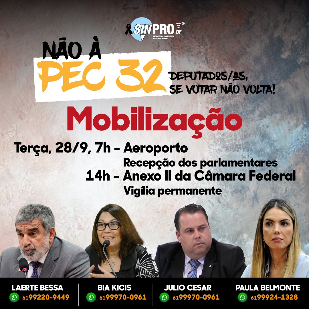 O Sinpro-DF convida os(as) professores(as) e orientadores(as) educacionais que puderem para participar da agenda de mobilização dessa terça-feira (28). A agenda terá início às 7h, no Aeroporto Internacional de Brasília, com a recepção dos(as) parlamentares. Às 14h todos(as) vão se dirigir ao Anexo II da Câmara dos Deputados, onde faremos uma vigília permanente, uma vez que a qualquer momento a PEC 32, que aborda a reforma Administrativa, pode ser votada.