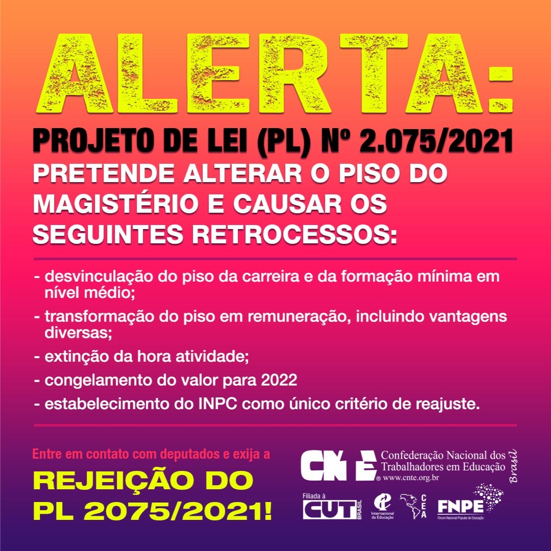 O Sinpro-DF convoca toda a categoria para pressionar os(as) deputados(as) federais pela retirada do Projeto de Lei 2.075/21 da pauta de votação dessa terça-feira (17), na Câmara dos Deputados. O projeto afronta o Plano Nacional de Educação (Lei 13.005) e traz inúmeros retrocessos ao Piso do Magistério, como o congelamento por três anos e a extinção da hora-atividade.