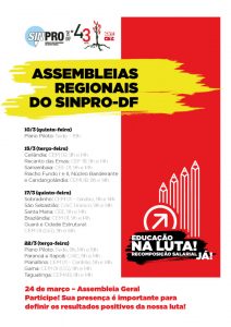 Após a categoria aprovar o Calendário de Lutas na Assembleia Geral, realizada no dia 22 de fevereiro, o Sinpro-DF convida os(as) professores(as) e orientadores(as) educacionais para as Assembleias Regionais a serem realizadas dias 10, 15, 17 e 22 de março em várias cidades-satélites do Distrito Federal.