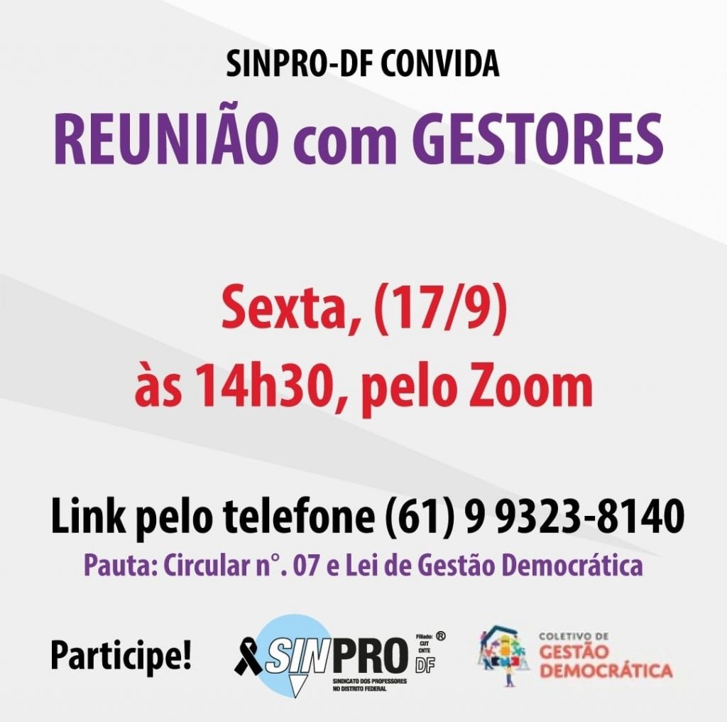 A diretoria colegiada do Sinpro-DF convida os(as) gestores(as) para reunião virtual pela plataforma Zoom, nesta sexta-feira (17), às 14h30, para discutir a pauta sobre a Circular nº 7 e a Lei de Gestão Democrática.