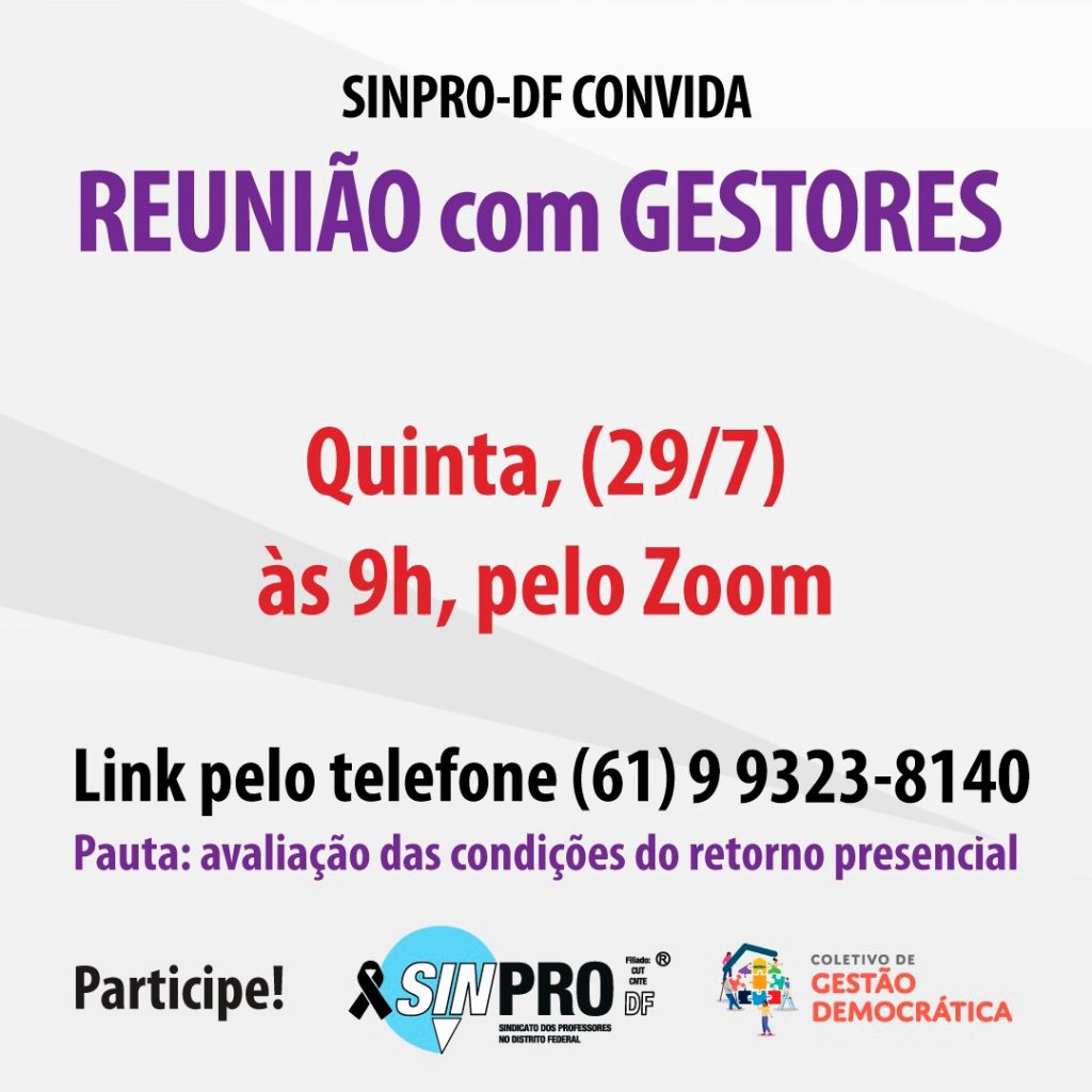 A diretoria colegiada do Sinpro-DF convida os(as) gestores(as) para reunião virtual, pela plataforma Zoom, nesta quinta-feira (29), às 9h. A pauta é sobre a avaliação das condições do retorno presencial.