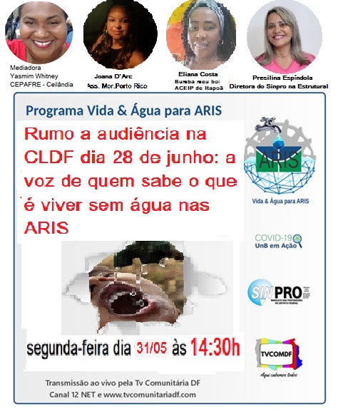 O Sinpro-DF convida para a live sobre o Programa Vida & Água para ARIS, nesta segunda-feira (31/5), às 14h30, ao vivo, pela TV Comunitária do DF, canal 12 da NET ou pelas redes sociais da TVComDF. O tema da live desta segunda é “Rumo à audiência na CLDF dia 28 de junho: a voz de quem sabe o que é viver sem água na ARIS”