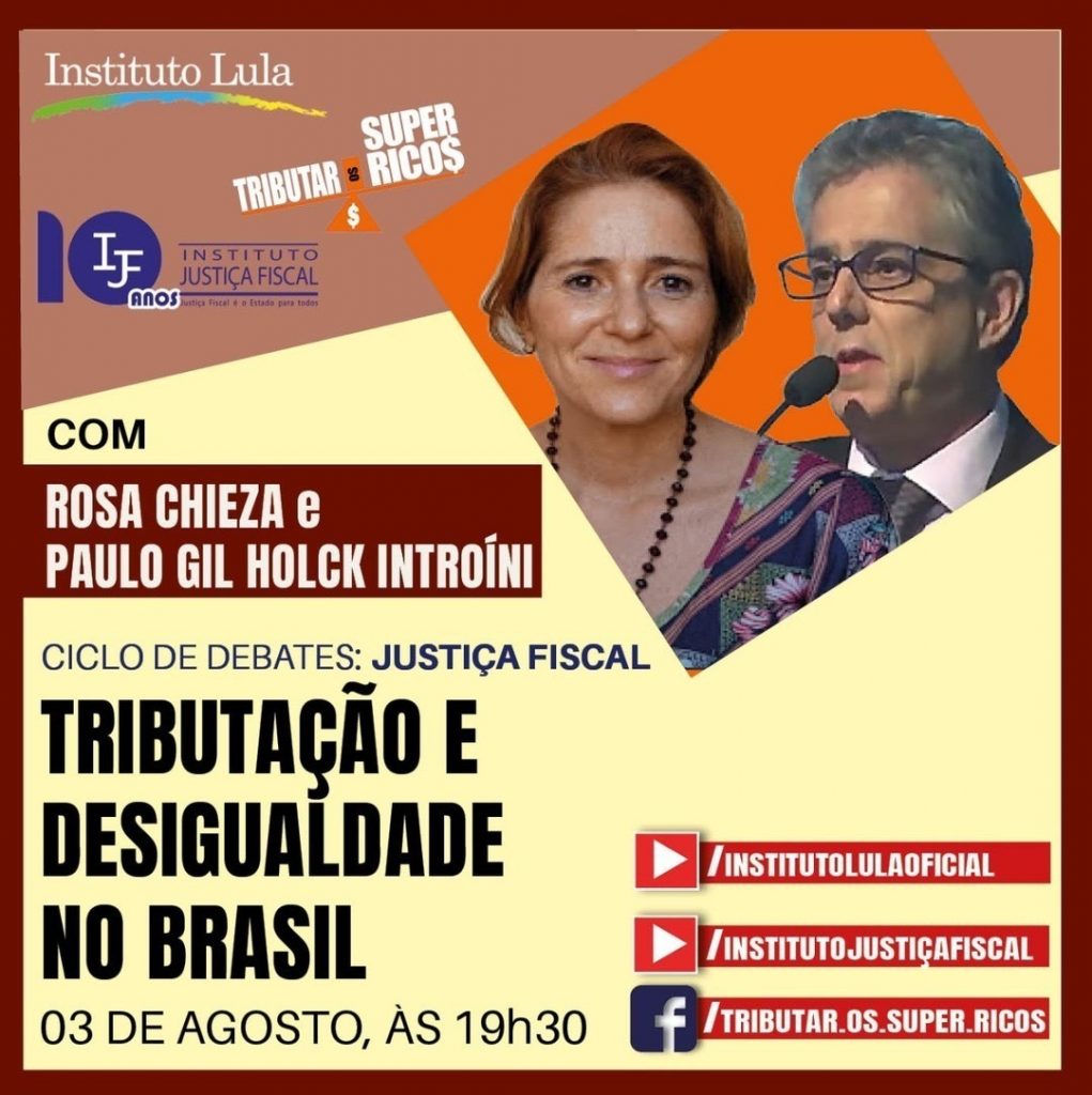 O Sinpro-DF convida a todos e todas para a live do ciclo de debates sobre justiça fiscal, nesta terça-feira (3/8), às 19h30, pelo YouTube do Instituto Lula Oficial e do Instituto Justiça Fiscal e pelo Facebook do Tributar os Super-Ricos. Nesta edição, o ciclo de debates traz Rosa Chieza e Paulo Gil Holck Introíni para debater “Tributação e desigualdade no Brasil”.