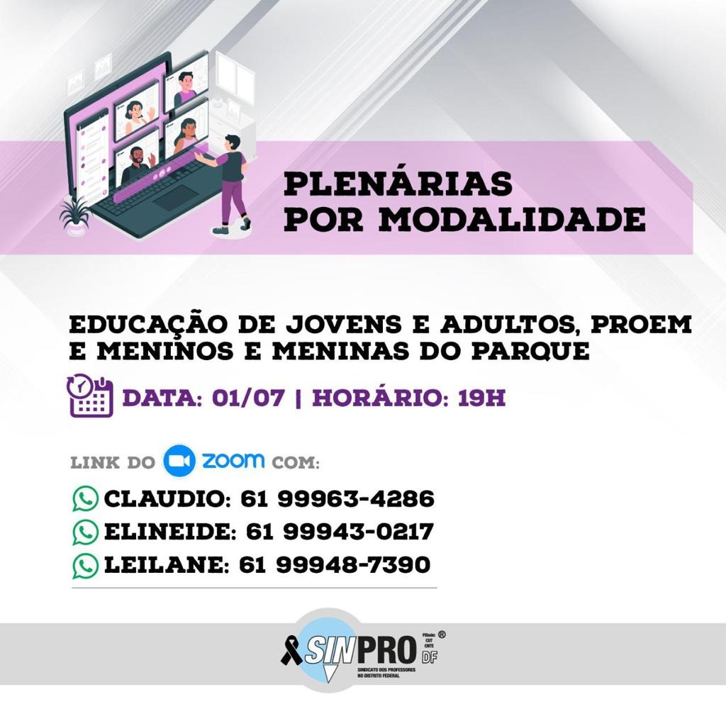 O Sinpro-DF convoca a categoria para participar das plenárias por modalidade com os(as) profissionais da Educação de Jovens e Adultos (EJA), Escola do Parque da Cidade (Meninos e Meninas do Parque) e Programa Ensino Médio Inovador (EPC/Proem), nesta quinta-feira (1º de julho), às 19h. As plenárias seguem o calendário de mobilizações aprovado pela categoria na última Assembleia Geral virtual e é realizada por meio da plataforma Zoom.