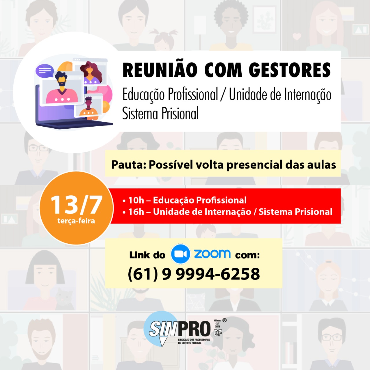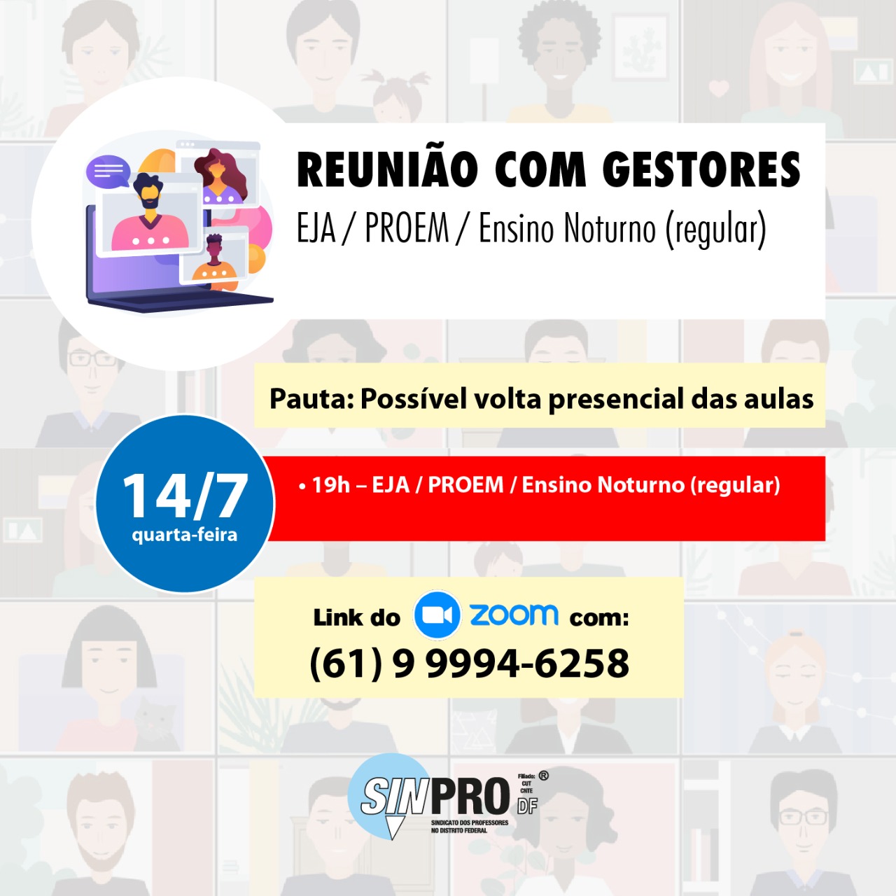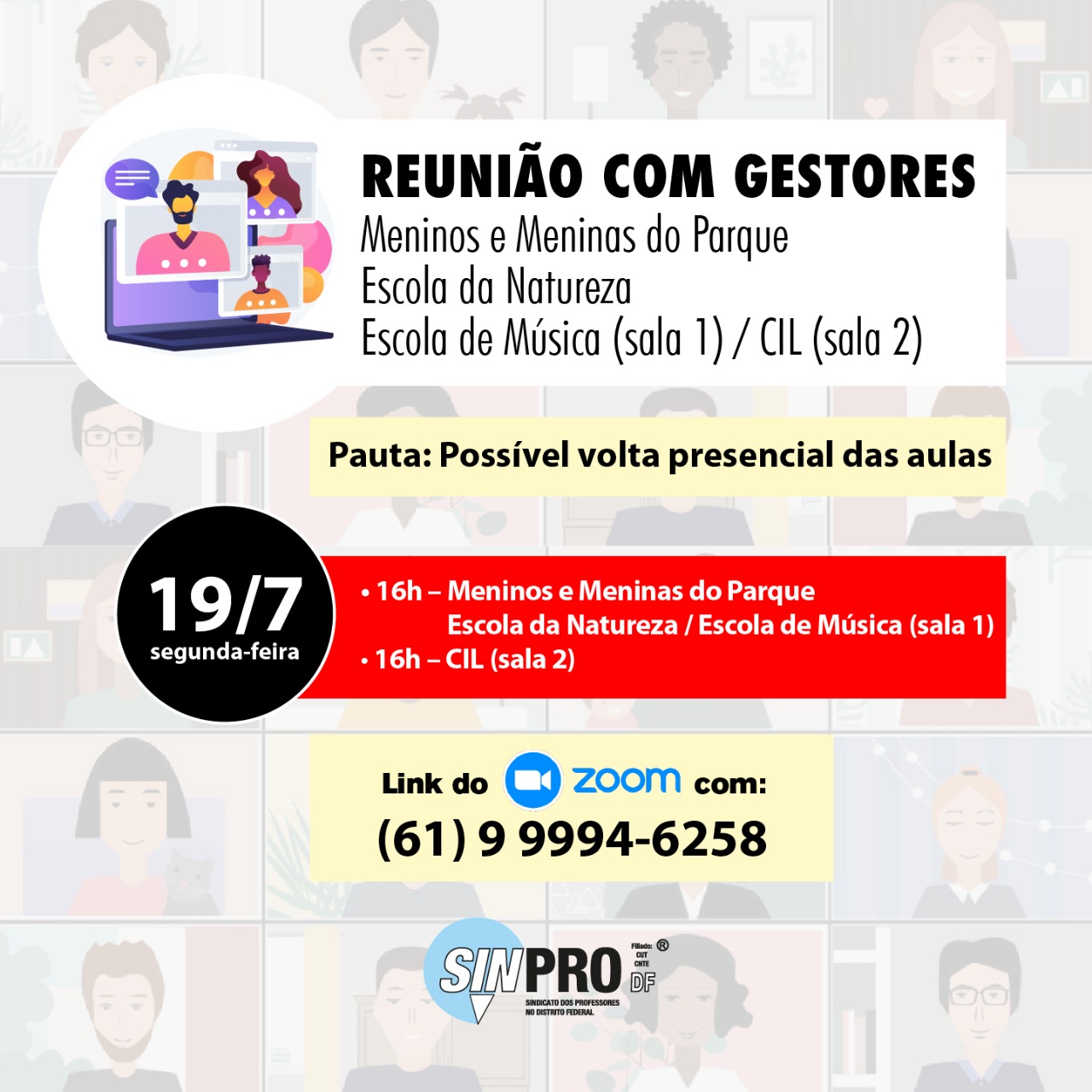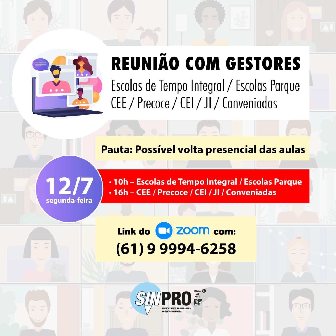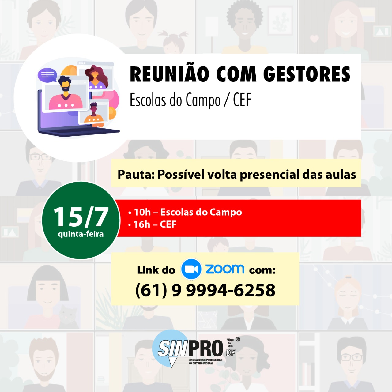 O Sinpro-DF convida os(as) servidores(as) das Coordenações Regionais de Ensino (CRE) e da sede para reunião, nesta sexta-feira (9), às 16h, pela plataforma Zoom. O encontro vai debater a possível volta presencial das aulas na rede pública, identificar fragilidades e pensar, coletivamente, as saídas. Na sequência, os(as) gestores(as) das modalidades listadas abaixo serão convidados(as) para dar continuidade ao debate. Para participar, solicite o link pelo WhatsApp pelo número (61) 99994-6258.