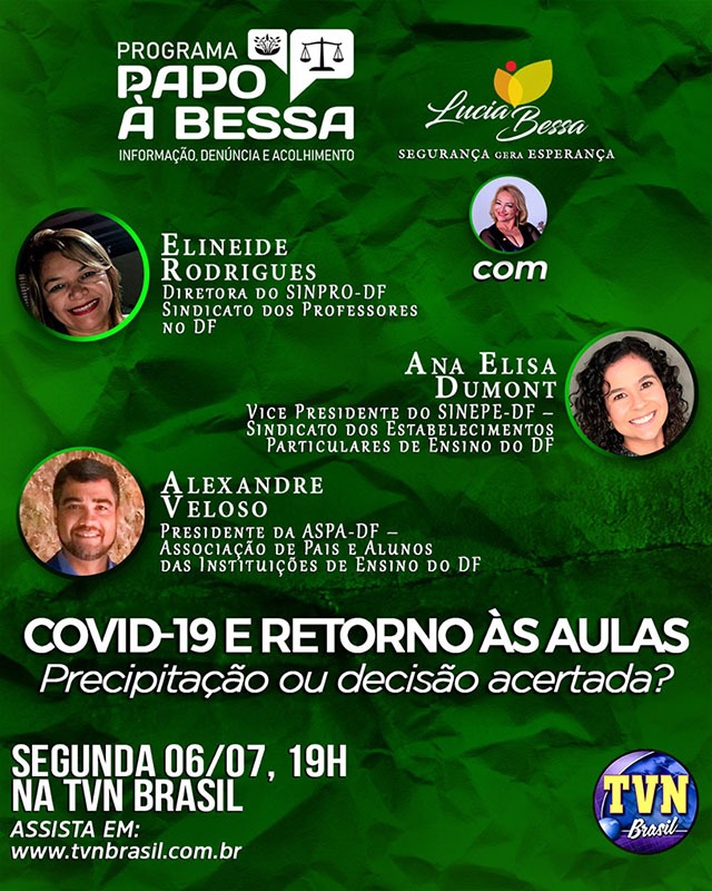 O Sinpro-DF participa de debate sobre a volta às aulas durante a pandemia no Papo à Bessa. O canal do YouTube Papo à Bessa vai debater, ao vivo, a volta às aulas presenciais. Nesta edição, haverá a participação de Elineide Rodrigues, diretora do Sinpro-DF. Acesse e participe!
