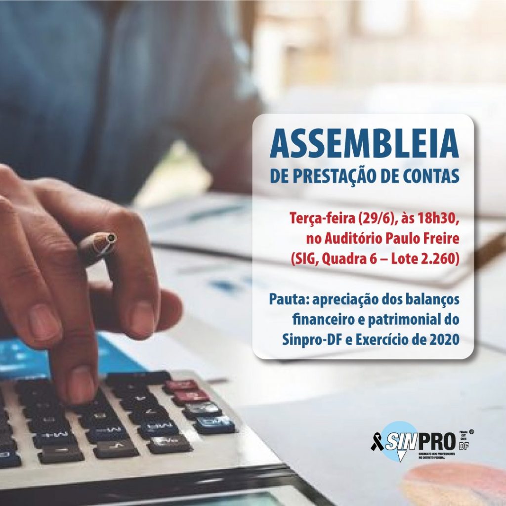 A diretoria do Sinpro-DF convida os(as) professores(as) e orientadores(as) educacionais sindicalizados(as) para Assembleia Geral Ordinária de Prestação de Contas, a ser realizada, na terça-feira (29), às 18h30, no Auditório Paulo Freire, situado no Setor de Indústrias Gráficas (SIG), Quadra 6 – Lote 2.260. A pauta é a apreciação dos balanços financeiros de patrimonial do Sinpro-DF