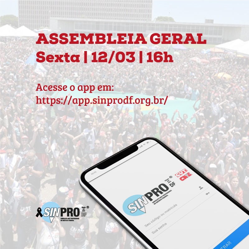 Para participar da assembleia geral do Sinpro-DF nesta sexta-feira (12), basta clicar no link https://app.sinprodf.org.br/. O endereço é do aplicativo do Sindicato e sua instalação para participar da assembleia é opcional. Ao clicar no link, por um computador de mesa ou qualquer dispositivo móvel, a/o participante acessará o app, onde terá acesso ao botão “assembleia”.