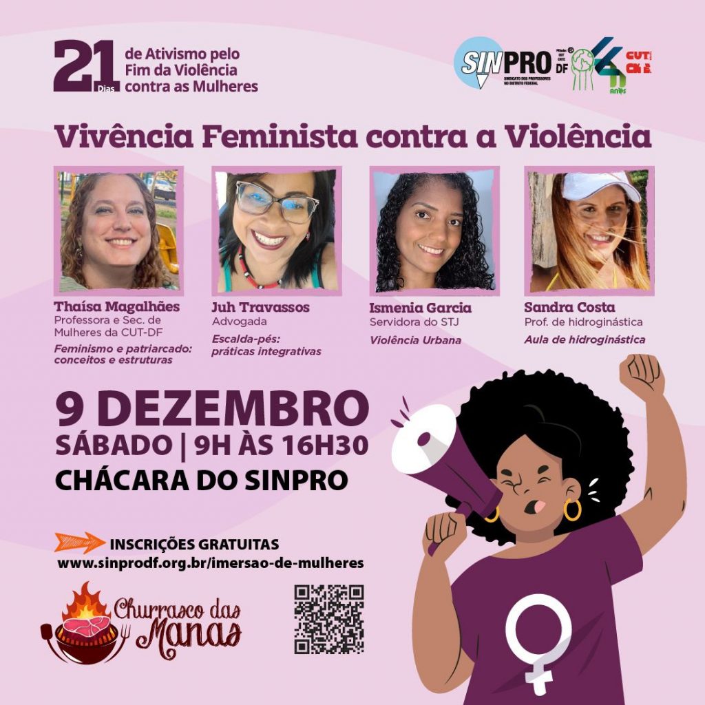 30Como parte das ações dos 21 Dias de Ativismo Pelo Fim da Violência Contra as Mulheres, o Sinpro-DF realizará atividade de vivência e formação neste 9 de dezembro (sábado), das 9h às 16h30, na Chácara do Sinpro. A atividade é exclusiva para filiadas ao sindicato. Faça sua inscrição AQUI