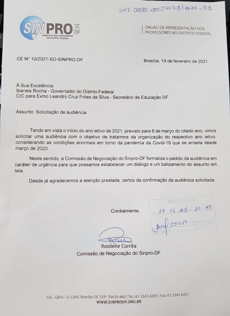 O pedido de audiência foi protocolado no Governo do Distrito Federal (GDF) em 19 de fevereiro, um dia após o governador confirmar, para a imprensa, o retorno das aulas presenciais na rede pública de ensino.