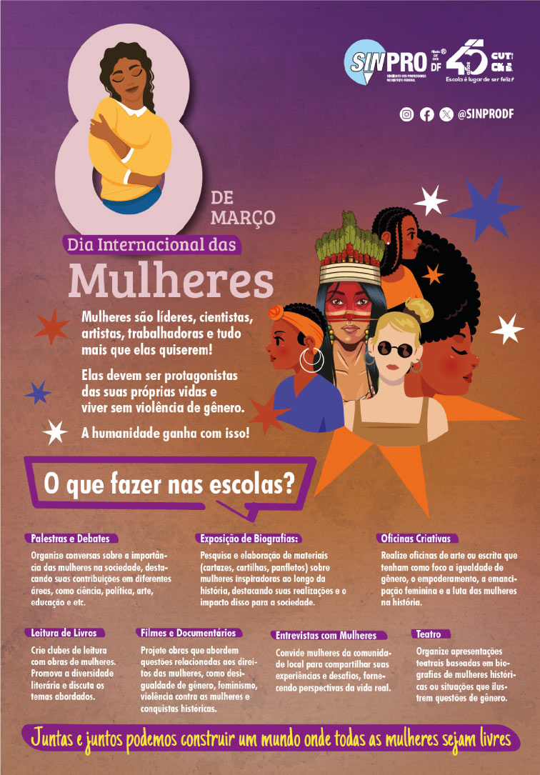 A partir dessa afirmação, a Secretaria de Mulheres do Sinpro preparou cartaz e folder que sugerem às escolas públicas do DF atividades para serem realizados no 8 de março, Dia Internacional de Luta das Mulheres.