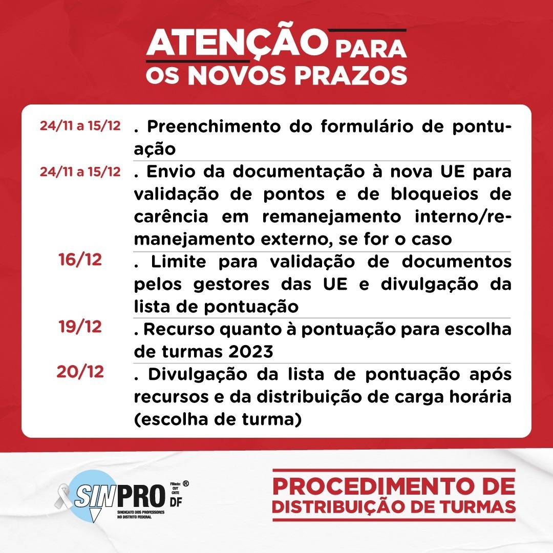 O Sinpro informa que houve alteração nos prazos para procedimento de distribuição de turmas e que as novas datas já estão disponíveis. Os novos prazos foram definidos a partir de negociação com o sindicato. Confira o novo calendário no final desta nota. Segundo o novo calendário, de 24/11 a 15/12 de 2022, é o período de preenchimento do formulário de pontuação e de envio da documentação a nova Unidade Escolar (UE) para validação de pontos e de bloqueio de carência em Remanejamento Interno/Remanejamento Externo, se for o caso.
