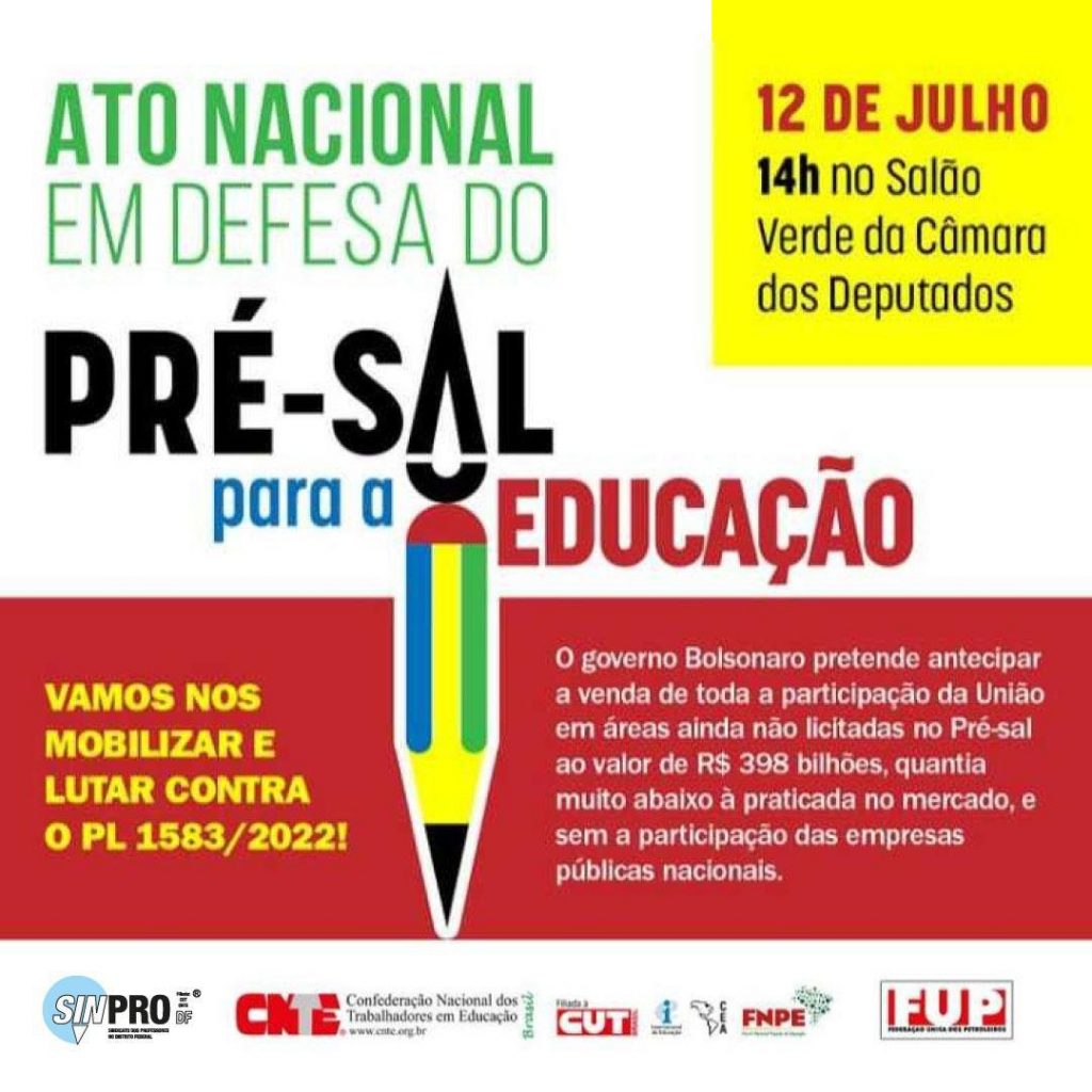 O Sinpro-DF e a Confederação Nacional dos Trabalhadores em Educação (CNTE) convidam a categoria e toda a comunidade escolar para um ato público nacional em defesa do pré-sal para a educação a ser realizado no dia 12 de julho, às 14h, no Salão Verde da Câmara dos Deputados.