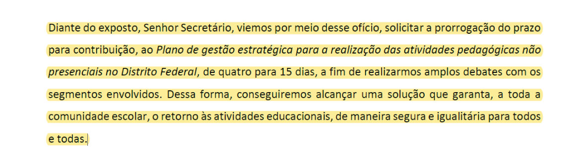 O Sinpro-DF enviou uma carta ao secretário de Estado da Educação (SEEDF), João Pedro Ferraz, na quinta-feira (21), requerendo a prorrogação de 15 dias para entregar as contribuições da categoria ao Plano de Gestão Estratégica para a Realização das Atividades Pedagógicas Não Presenciais do Distrito Federal. Em resposta, o secretário estendeu o prazo até o dia 27/5, mas, no entendimento da categoria, 7 dias também é pouco tempo para analisar o documento.