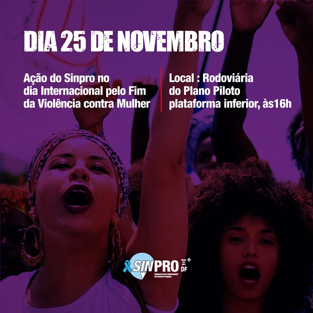 O Sinpro convida toda a comunidade escolar do Distrito Federal para participar de uma ação nessa quinta-feira (25), a partir das 16h, na plataforma inferior da Rodoviária do Plano Piloto. No Dia Internacional pelo Fim da Violência contra as Mulheres, os(as) professores(as), orientadores(as) educacionais e profissionais da educação vamos aderir à campanha internacional contra o desrespeito e a violência direcionada à mulher.