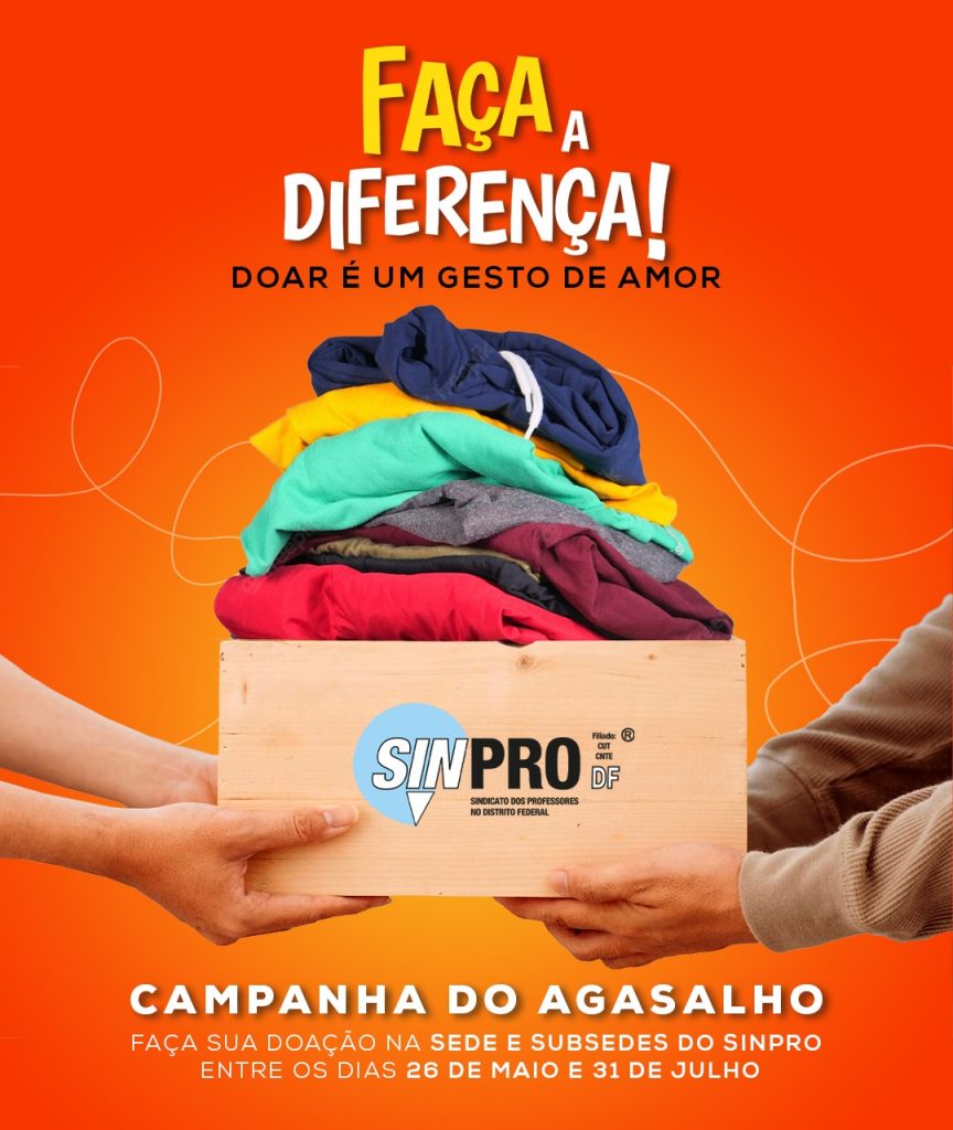 O Sinpro já iniciou sua tradicional campanha do agasalho. Com o lema “Faça a diferença! Doar é um gesto de amor”, a campanha visa a estimular a categoria a praticar o desapego e a exercer a solidariedade em favor de quem nada tem. Doar agasalhos a quem precisa nesta época de frio é também uma forma de justiça social.