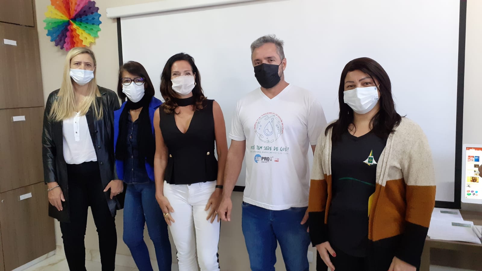 Da esquerda para a direita: Michelle Aline (diretora), Niedia Lucena (vice-diretora), Luciane Kozicz (psicóloga do Sinpro), Anderson Corrêa (diretor do Sinpro-DF) e Aline (supervisora)
