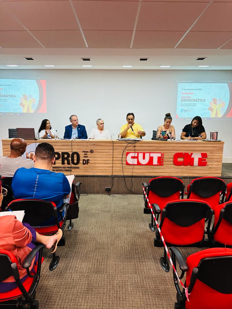 Na mesa seguinte, os diretores da Secretaria de Políticas Educacionais do Sinpro, Carlos Maciel e Berenice Darc, receberam o assessor de políticas institucionais do IFB, Adilson César de Araújo, que falou sobre o panorama geral da Gestão Democrática.