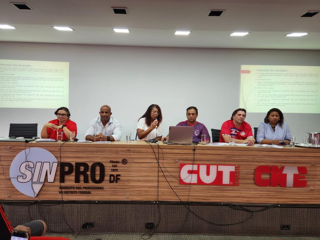 A mesa de abertura, mediada pelo diretor do Sinpro Cláudio Antunes, contou com a participação de Álvaro Domingues, do Conselho de Educação do DF; Beatriz Nobre, da diretoria de Mulheres da União Brasileira dos Estudantes Secundaristas (Ubes) a da representante de Povos Originários da União Nacional dos Estudantes (UNE), Tamara Potiguara, além de Júlio Barros, do Fórum Distrital de Educação (FDE), e a representante da Confederação Nacional dos Trabalhadores em Educação (CNTE), Berenice Darc.