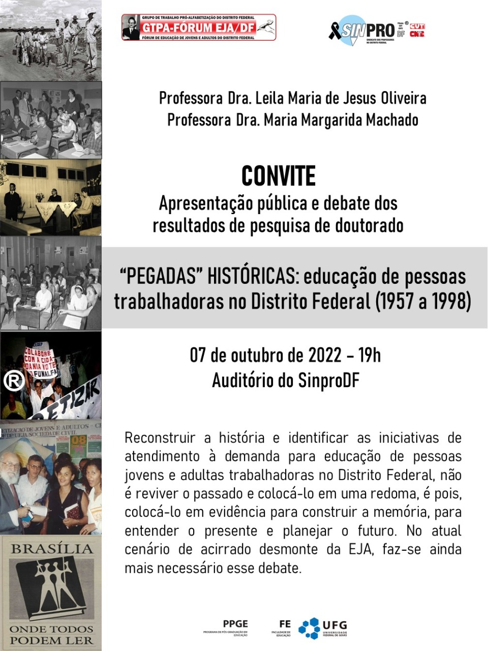 Amanhã (07/10), a professora Leila Maria de Jesus Oliveira apresenta no auditório do Sinpro, às 19h, os resultados da pesquisa de sua tese de doutoramento intitulada “Pegadas” Históricas: educação de pessoas trabalhadoras no Distrito Federal (1957 a 1998). A orientadora da pesquisa, professora Dra. Maria Margarida Machado (PPGE/UFG) também irá participar.