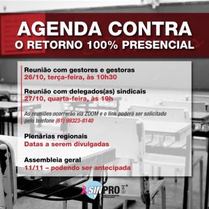 Nesse momento, diante da importância da gestão democrática, o Sinpro convoca gestores e gestoras para reunião na próxima terça-feira, 26 de outubro, às 10:30. É necessário que os gestores e gestoras organizem devidos debates junto às famílias, garantindo a participação de todos os segmentos das comunidades escolares, para que possamos avaliar a real necessidade do retorno das aulas 100% presenciais.