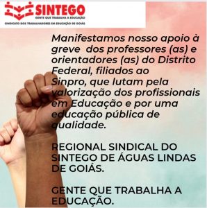 O Sindicato dos Trabalhadores em Educação em Goiás (Sintego) – Regional Águas Lindas – também manifestou total e irrestrito apoio à greve dos(as) professores(as) e orientadores(as) educacionais da rede pública de ensino do Distrito Federal.  A categoria luta pela valorização profissional, 8 anos sem nenhum reajuste, condições dignas de trabalho e por uma educação pública de qualidade. A greve é um direito Constitucional, portanto, uma ferramenta legítima para reivindicações dos direitos da categoria.