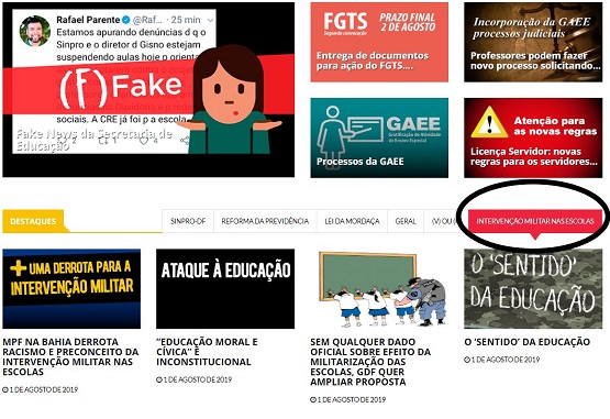 O Sinpro elaborou um novo espaço no site do sindicato específico para divulgação de materiais relacionados à militarização das escolas públicas no Distrito Federal. A categoria surgiu da necessidade de intensificar o debate sobre o tema e a área servirá, inclusive, como fonte de pesquisa para professores(as) e orientadores(as) que estão cursando uma segunda graduação ou pós graduação e que farão seus trabalhos de conclusão acerca da militarização.