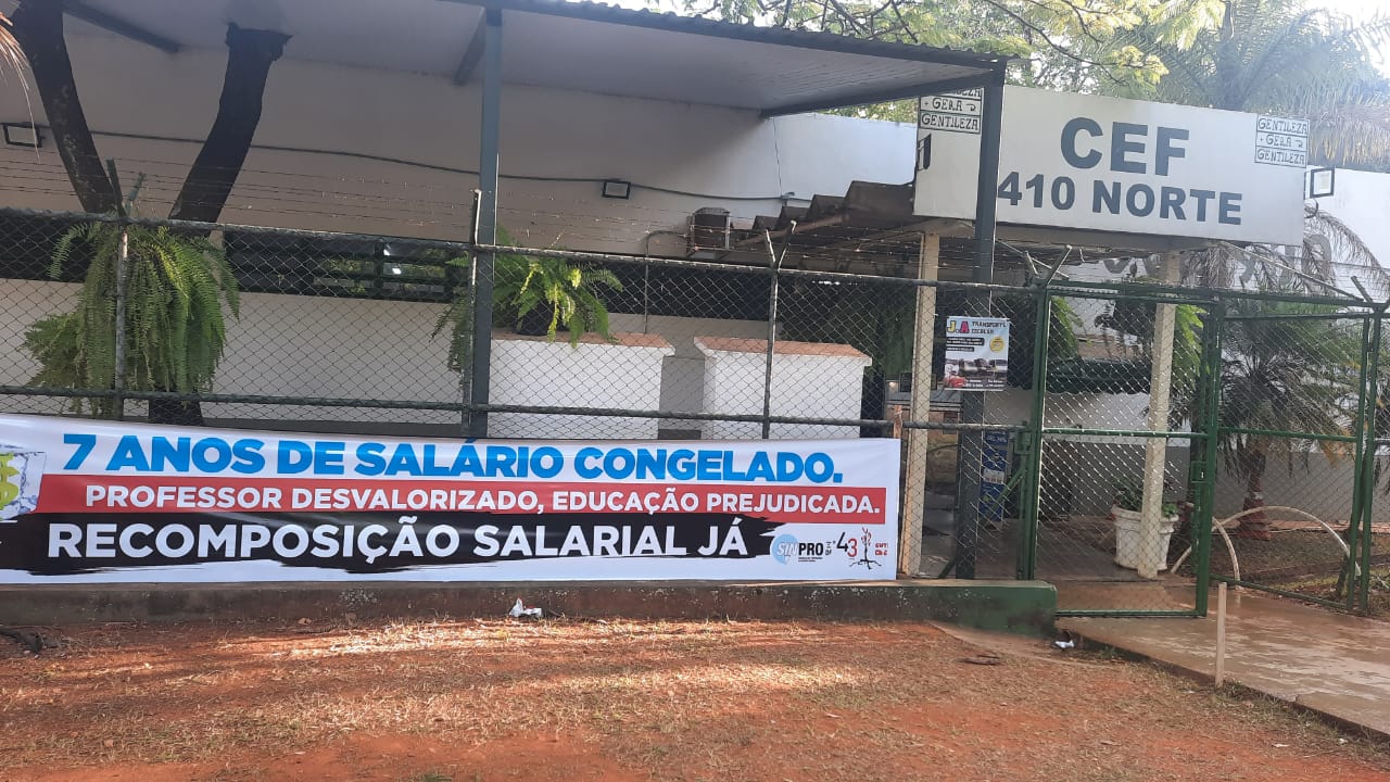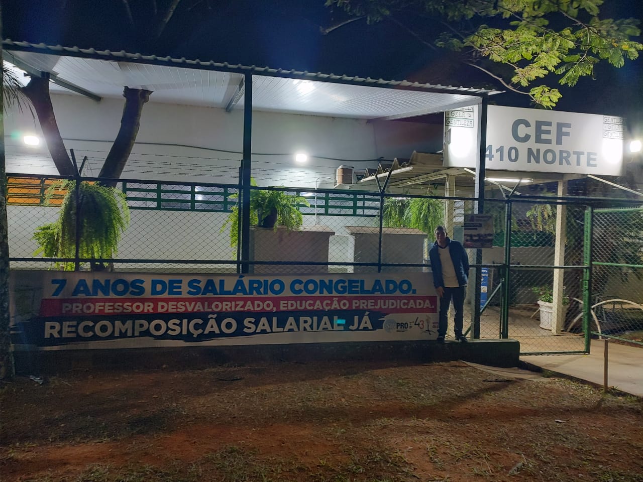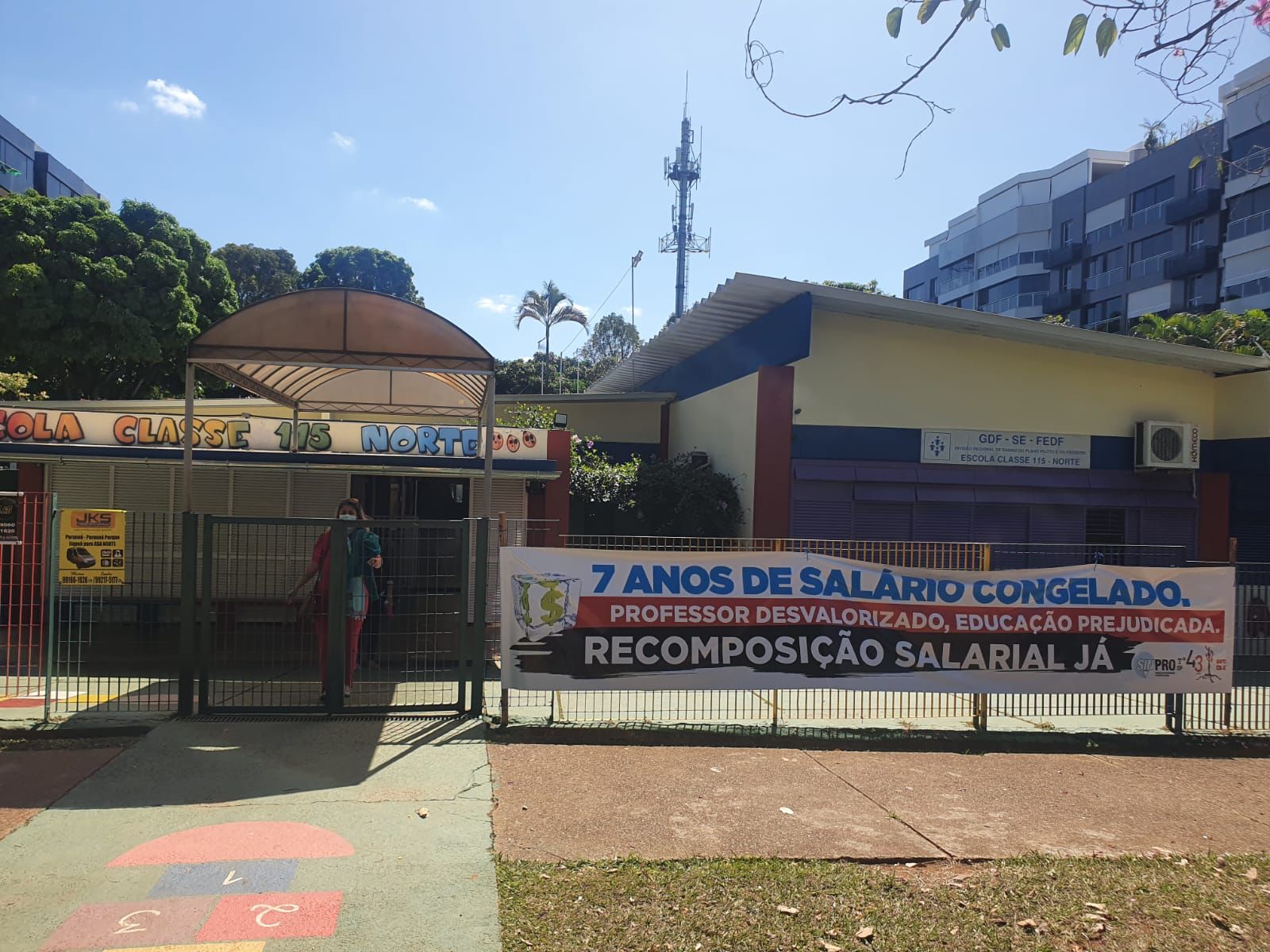 A categoria está dando o recado para a população do Distrito Federal sobre a situação dos(as) professores(as) e orientadores(as) educacionais na capital federal. Desde a semana passada os(as) professores(as) estão colocando faixas nas portas das escolas da rede pública relatando que os(as) educadores(as) estão com os salários congelados há 7 anos. Além disto, as faixas também afirmam que a educação pública no DF está abandonada pelo governo, com turmas superlotadas, com falta de educadores(as) e com a escola pública sendo desvalorizada.