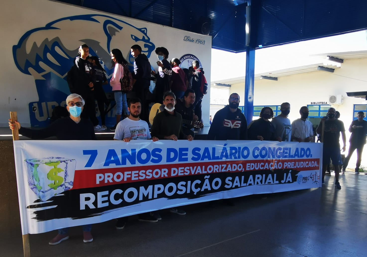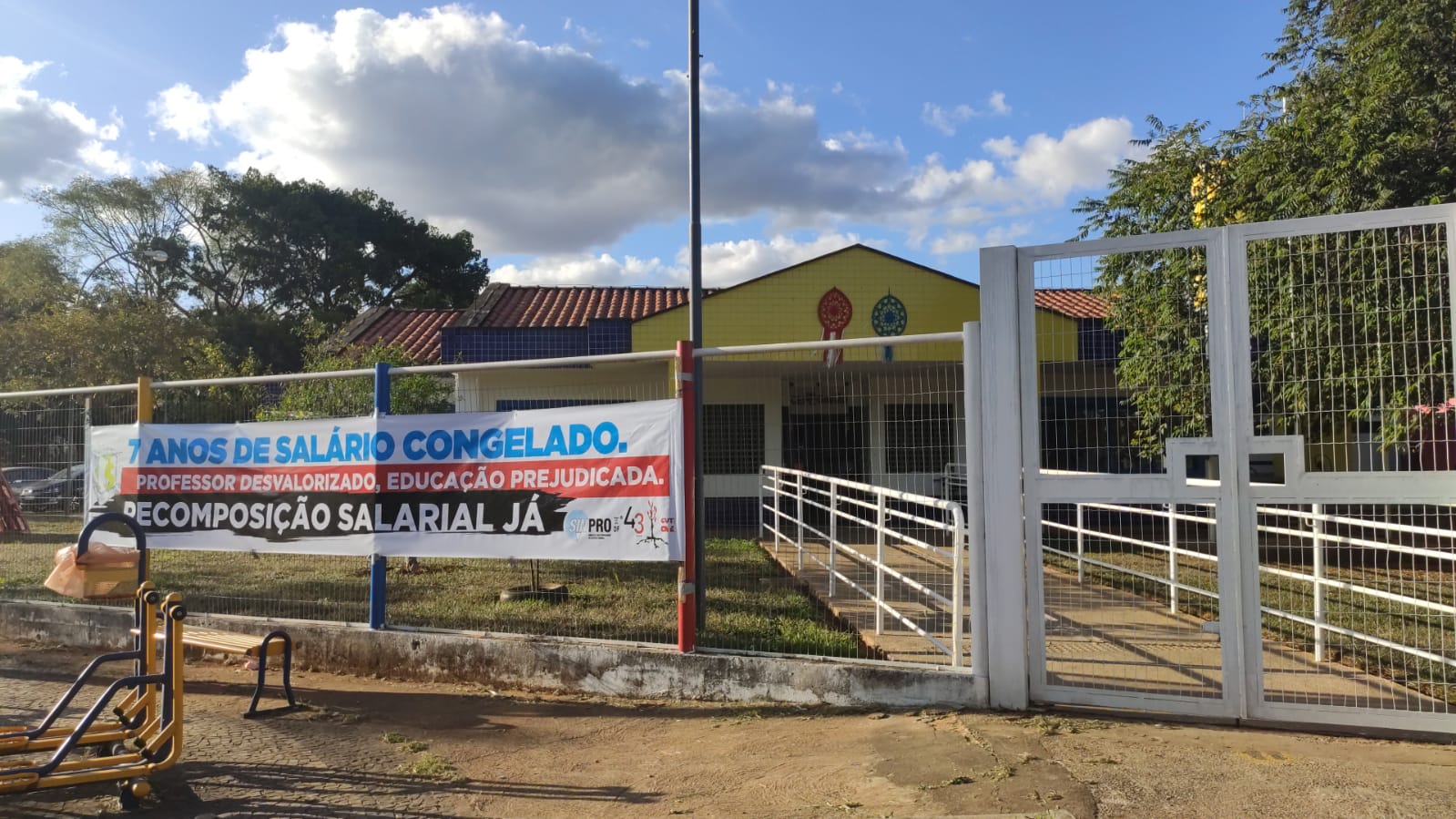 Professores colocam faixas na porta das escolas denunciando sete anos sem reajuste salarial para a categoria