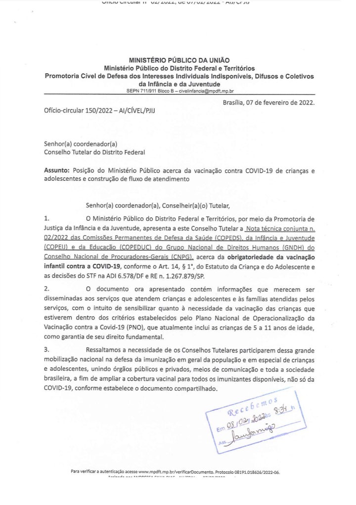De outro, o Ministério Público do Distrito Federal e Territórios (MPDFT), totalmente favorável à imunização infantil, defensor da ciência e das comprovações científicas de que a vacinação contra a covid-19 salva vidas, emitiu a Nota Técnica conjunta n° 02/22, na qual exige o cumprimento da obrigatoriedade da vacinação infantil contra a covid-19.