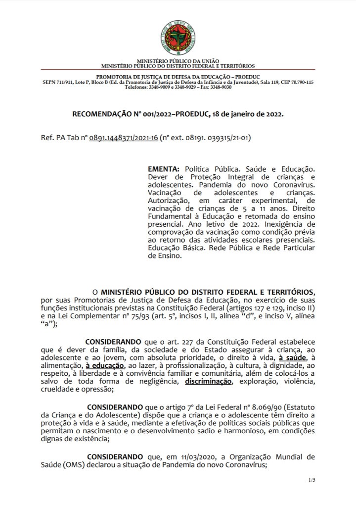 De um lado, a Promotoria de Justiça de Defesa da Educação (Proeduc) decidiu seguir a opinião do MMFDH, defender a não vacinação de crianças e emitiu a Recomendação 001/22, na qual diz que a vacinação é experimental e desobriga a apresentação do passaporte de vacinação.