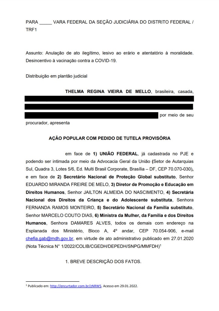 A ministra Damares irá responder a outros processos por causa dessa decisão de negar a ciência, colocar em dúvida a vacinação de crianças e impedir a exigência do passaporte de vacinação. A conselheira tutelar da Asa Sul, Thelma Melo, entrou na Justiça com uma ação popular contra a ministra e sua equipe técnica por conta do desvio de função do Disque 100. “Isso é muito preocupante. A ação de Damares é muito danosa porque incentiva a não vacinação”, justifica.
