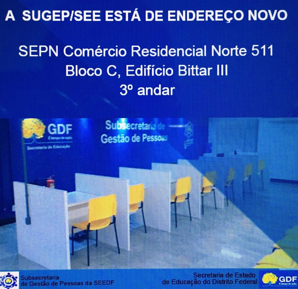 O Sinpro informa que a partir dessa terça-feira (14) a Subsecretaria de Gestão de Pessoas (SUGEP) funcionará no SEPN 511 (Setor de Edifícios de Utilidade Pública Norte), Bloco C, Edifício Bittar III, 3º andar. O novo endereço é o mesmo onde funciona a Coordenação Regional de Ensino do Plano Piloto/Cruzeiro.