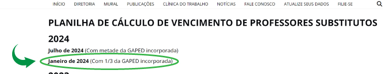 3 – Dentro da aba “Planilha Cálculo Salarial CT”, clique no link intitulado “Janeiro de 2024 (Com 1/3 da GAPED incorporada)”