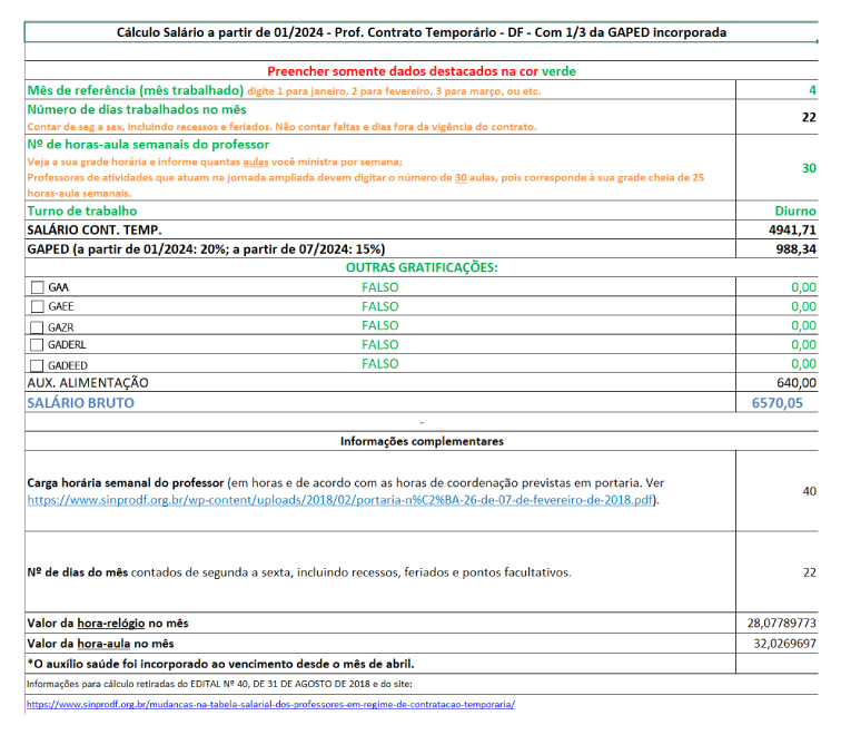 Já está disponível, no site do Sinpro-DF, a planilha que auxilia os(as) professores(as) do contrato temporário a fazerem seus cálculos salariais para o ano de 2024. A planilha está calibrada para calcular toda a variação salarial deste ano de 2024.
