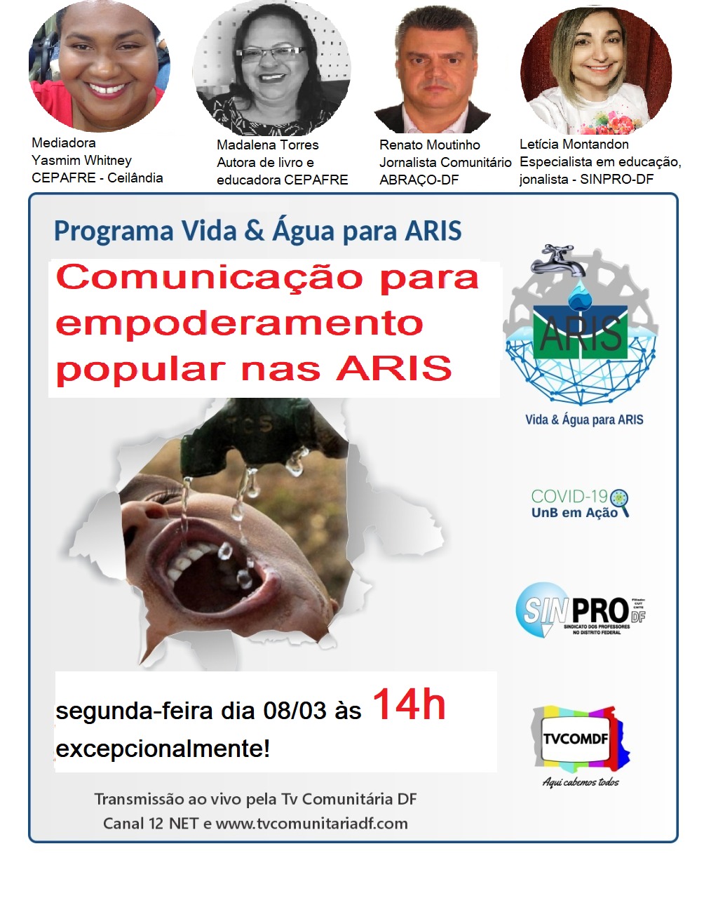A TV Comunitária desta segunda-feira (08) transmite, ao vivo, mais um Programa Vida & Água para ARIS. Às 14h, Yasmim Whitney, do CEPAFRE – Ceilândia, debate a Comunicação para empoderamento popular nas ARIS com Madalena Torres, autora de livro e educadora CEPAFRE; Renato Moutinho, jornalista comunitário ABRAÇO-DF; e com Letícia Montandon, especialista em educação e diretora do Sinpro.