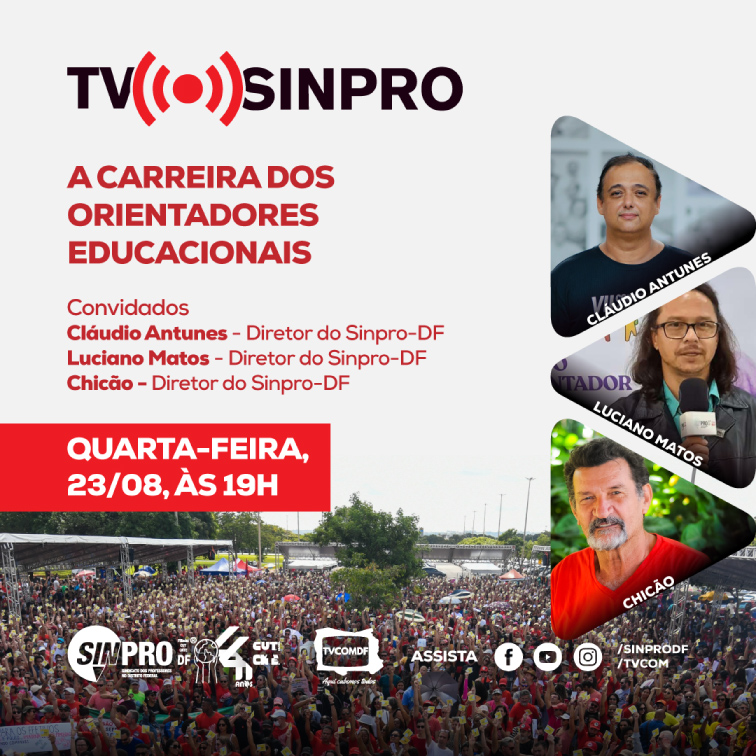 A próxima edição do TV Sinpro, nesta quarta-feira (20), às 19h, vai explicar, ponto a ponto, as propostas negociadas no acordo de suspensão de greve com o Governo do Distrito Federal (GDF) relativamente aos(às) orientadores(as) educacionais. Os diretores do Sinpro-DF Cláudio Antunes, Luciano Matos e Chicão estarão à frente do programa, que será transmitido ao vivo pela TV Comunitária e pelo Youtube e Facebook do sindicato.