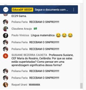A reportagem do Sinpro acompanhou a entrevista coletiva da secretária Hélvia Paranaguá pelo youtube. No chat da plataforma, vários profissionais do magistério também acompanharam o evento online, e se manifestaram sobre diversas questões. A mais recorrente era a superlotação das salas de aula – tema que foi deliberadamente ignorado pela secretária. Havia denúncias de superlotação até mesmo em turmas inclusivas. Também ocorreram alertas sobre a falta de profissionais de disciplinas específicas. Tudo totalmente ignorado. Comentários com cobranças de diálogo da SEEDF com o Sinpro foram apagados pelo moderador (fotos).
