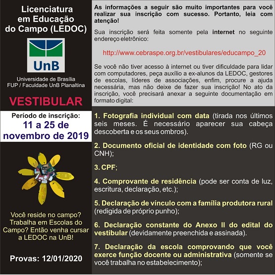 A Universidade de Brasília (UnB) publicou edital que torna pública a realização de vestibular destinado a selecionar candidatas (os) para o ingresso no curso de Licenciatura em Educação do Campo (LEDOC), no primeiro e no segundo semestres letivos de 2020. Serão oferecidas 120 vagas na modalidade presencial. As inscrições são gratuitas e podem ser feitas até o dia 25, no endereço eletrônico http://www.cebraspe.org.br/vestibulares/educampo_20