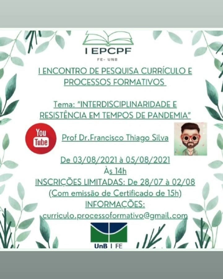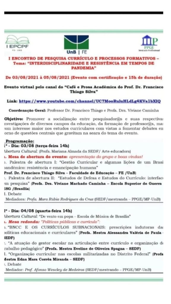 Um grupo de pesquisa do Programa de Pós-Graduação em Educação, Modalidade Profissional (PPGE/MP) na Faculdade de Educação (FE), da Universidade de Brasília (UnB), realiza, de 3 a 5 de agosto, o I Encontro de Pesquisa, Currículo e Processos Formativos. O evento, que traz como tema Interdisciplinaridade e resistência em tempos de pandemia, propõe debater e socializar possíveis sínteses das palestras, mesas e momentos de discussões previstos para ocorrer durante os três dias de realização do Encontro.