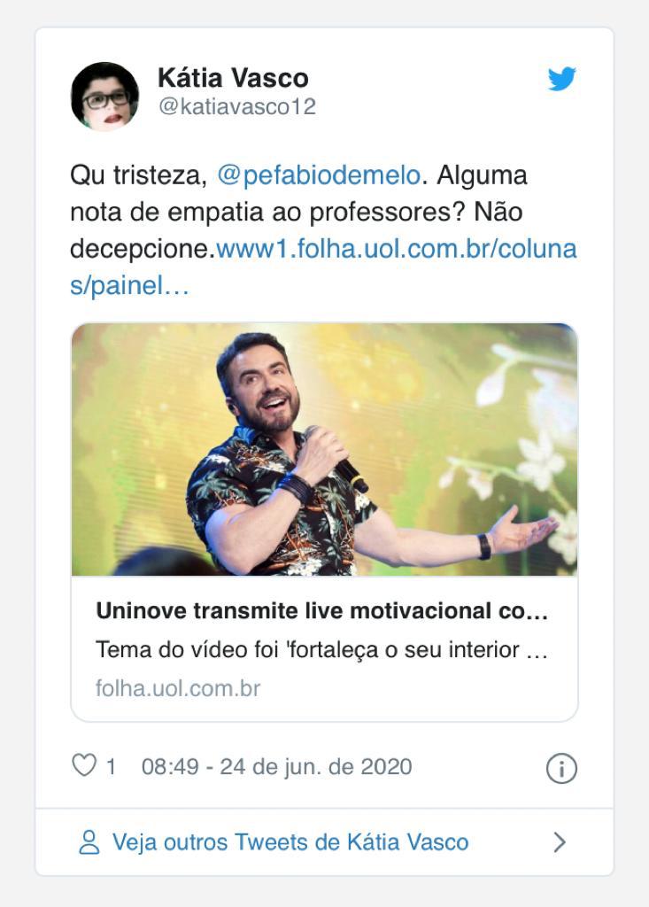 Outros, como Kátia Vasco, cobraram alguma empatia do padre Fábio Melo aos professores demitidos. “Alguma nota de empatia aos professores? Não decepcione”, escreveu em um post no Twitter.