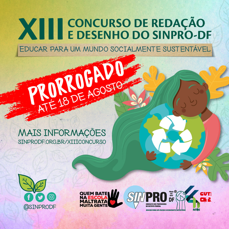 O período de inscrição para participar do XIII Concurso de Redação e Desenho do Sinpro-DF foi prorrogado e encerra hoje. Não haverá nova prorrogação. Então corra, faça a sua inscrição e envie o seu trabalho até às 23h59 de hoje (18). A atividade, que este ano traz como tema “Educar para um mundo socialmente sustentável”, é gratuita e direcionada a estudantes da rede pública de ensino do Distrito Federal. Faça AQUI sua inscrição.